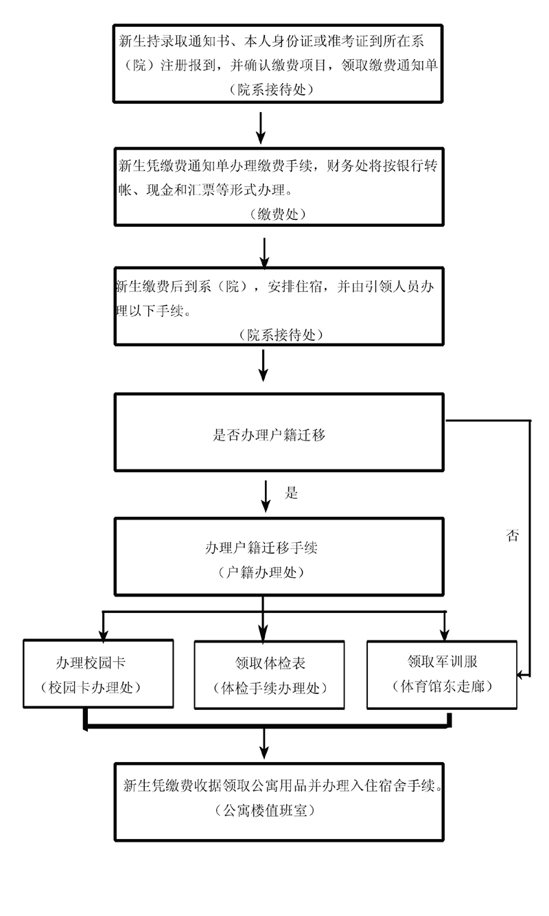 新生進校后,請按照報到流程圖所示順序辦理入學手續(詳見流程圖)。
