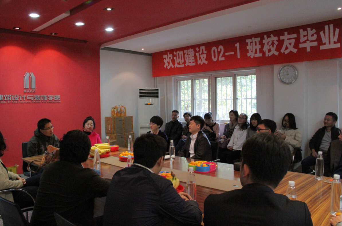 11月31日,建筑設計與裝飾學院建設02-1班全體校友返校聚會,學院副書記婁志剛、設計專業負責人李提蓮、班主任張靜、專業老師陳淑萍老師參加座談。