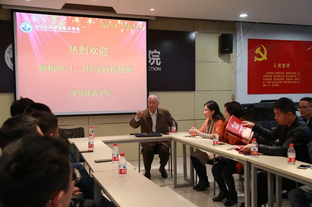 10點(diǎn)左右,同學(xué)們來到建筑建造學(xué)院的會議室,與學(xué)院領(lǐng)導(dǎo)、老師們進(jìn)行了座談會。此次聚會,當(dāng)年的三位班主任:安沁麗老師、于殿寶老師以及趙崢老師欣然接受同學(xué)們的邀請,教務(wù)處處長戚豹、建造學(xué)院黨總支書記孫武、鋼結(jié)構(gòu)專業(yè)主任孫韜和王培興老師也都熱情的參與其中,并對老校友們的回訪,表示熱烈歡迎。