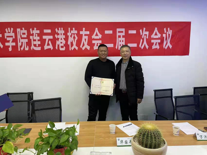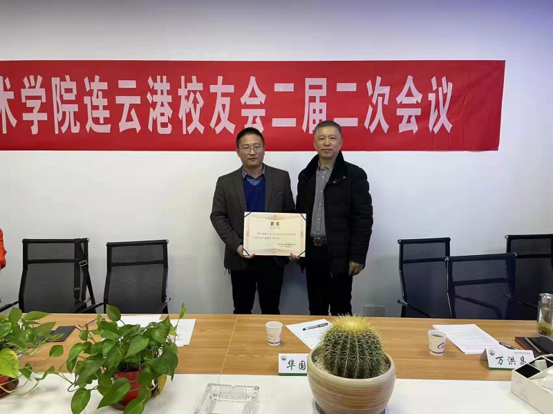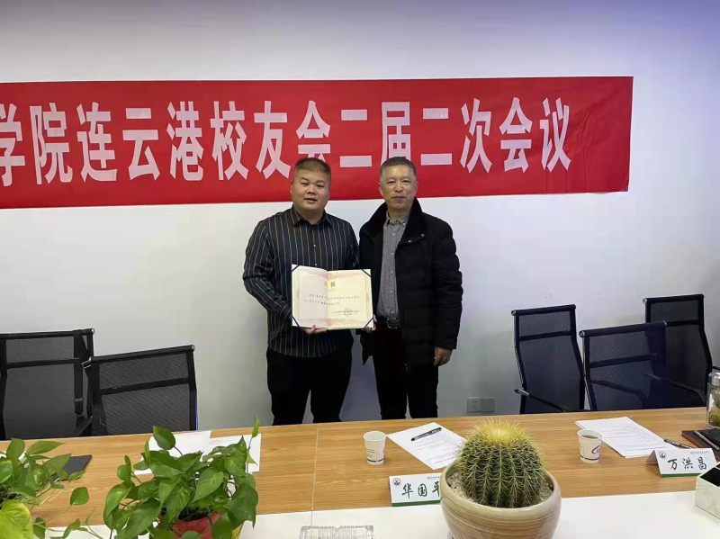 江蘇建筑職業(yè)技術(shù)學(xué)院校友辦白樺老師宣讀了學(xué)校校友總會(huì)有關(guān)同意連云港校友會(huì)增補(bǔ)理事的批復(fù)文件,華國平老師為新當(dāng)選的副會(huì)長頒發(fā)聘書。