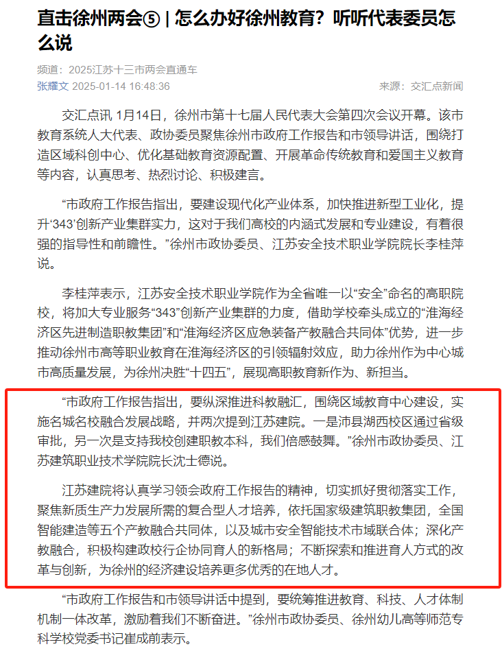 江蘇建院將認真學習領會政府工作報告的精神,切實抓好貫徹落實工作,聚焦新質生產力發展所需的復合型人才培養,依托國家級建筑職教集團,全國智能建造等五個產教融合共同體,以及城市安全智能技術市域聯合體;深化產教融合,積極構建政校行企協同育人的新格局;不斷探索和推進育人方式的改革與創新,為徐州的經濟建設培養更多優秀的在地人才。