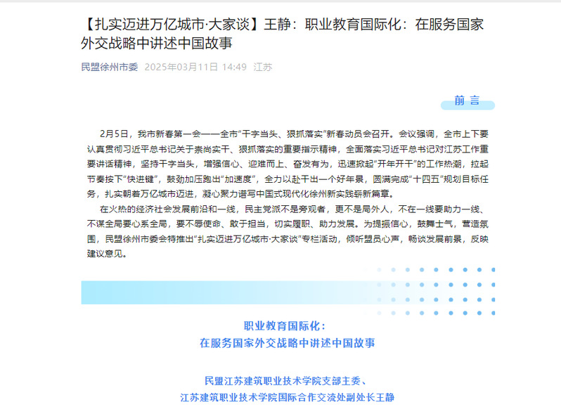 在徐州這座歷史悠久而又充滿活力的城市中,我們正攜手并進(jìn),向著萬(wàn)億級(jí)城市的宏偉目標(biāo)扎實(shí)邁進(jìn)。作為徐州民盟的一員,同時(shí)也是民盟江蘇建筑職業(yè)技術(shù)學(xué)院支部的主委,我深感責(zé)任重大,使命光榮。特別是在當(dāng)前全球化背景下,職業(yè)教育國(guó)際化不僅是提升我國(guó)教育國(guó)際影響力的重要途徑,也是服務(wù)國(guó)家外交戰(zhàn)略、助力中資企業(yè)“走出去”的關(guān)鍵一環(huán)。在此,我愿結(jié)合個(gè)人崗位實(shí)際,就如何在職業(yè)教育國(guó)際化進(jìn)程中貢獻(xiàn)力量,輸出中國(guó)職教標(biāo)準(zhǔn),講述中國(guó)故事,談幾點(diǎn)思考與建議。