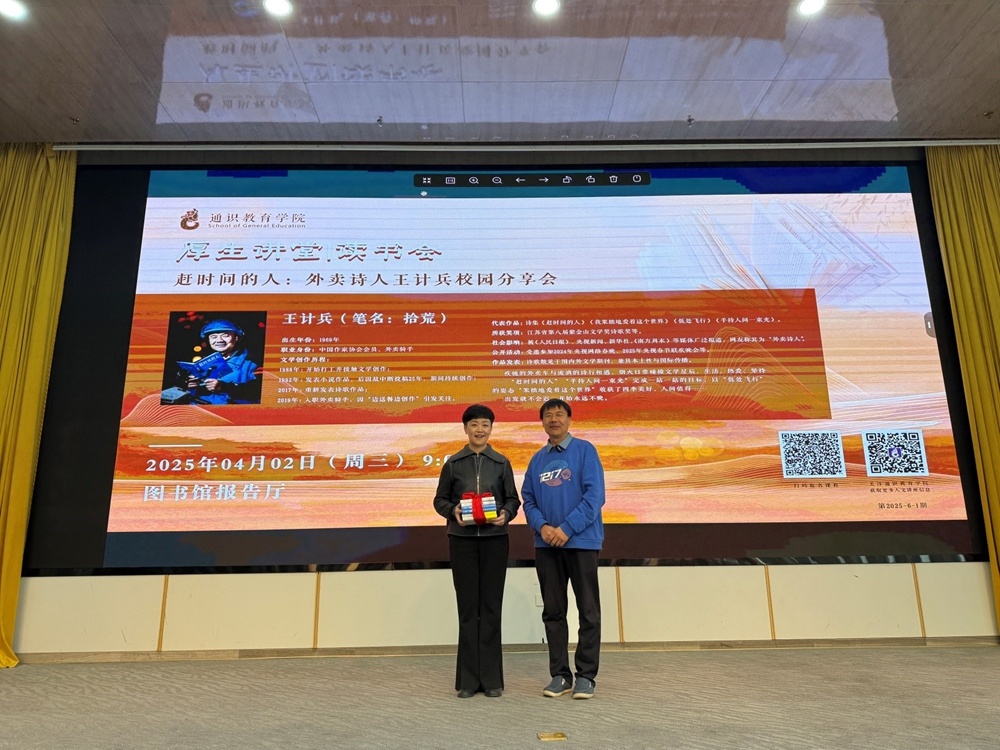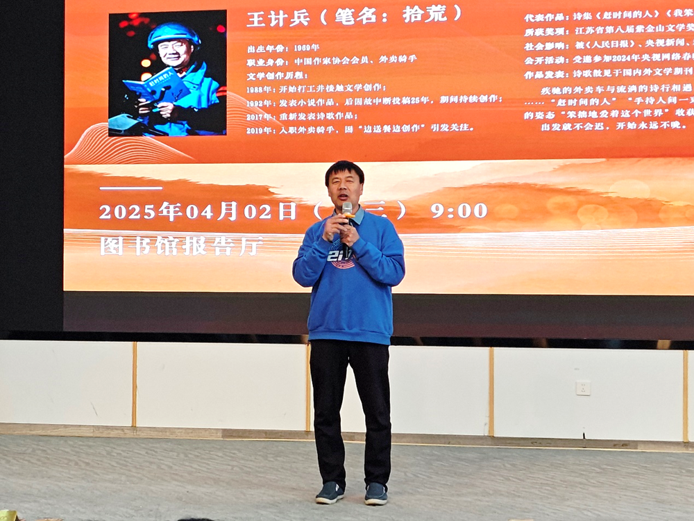 4月2日,江蘇建筑職業技術學院“厚生講堂”,迎來一位特殊的嘉賓——被稱為“外賣詩人”的勞動者作家王計兵。這位身穿藍色工裝、手持詩集的外賣騎手,用質樸的語言和真摯的情感,為師生帶來了一場關于“趕時間的人”的分享會,用親身經歷詮釋了新時代勞動者的精神追求與文化自信。