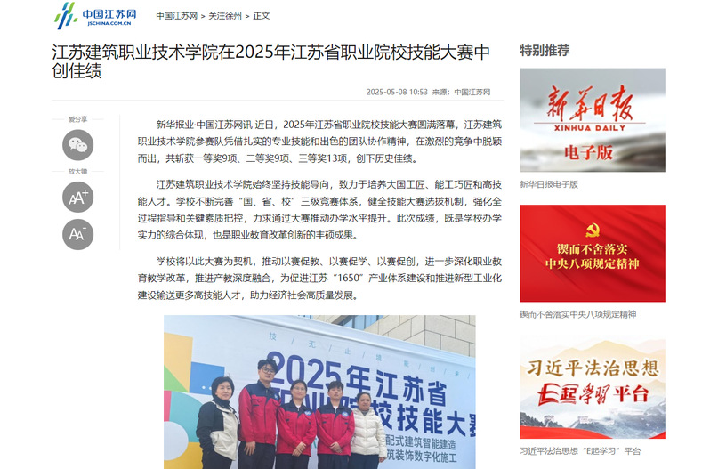 新華報業·中國江蘇網訊 近日,2025年江蘇省職業院校技能大賽圓滿落幕,江蘇建筑職業技術學院參賽隊憑借扎實的專業技能和出色的團隊協作精神,在激烈的競爭中脫穎而出,共斬獲一等獎9項、二等獎9項、三等獎13項,創下歷史佳績。