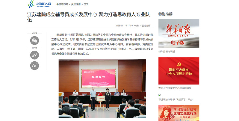 新華報業·中國江蘇網訊 為深入貫徹落實全國和全省教育大會精神,扎實推進新時代立德樹人工程,5月15日下午,江蘇建筑職業技術學院在學校創翼學堂舉行輔導員成長發展中心成立儀式。校黨委副書記梁惠出席儀式并為中心揭牌,黨委組織部、黨委宣傳部、人事處、學工處、團委、馬克思主義學院等相關部門負責人,各二級學院黨總支副書記及全體專職輔導員參加儀式。