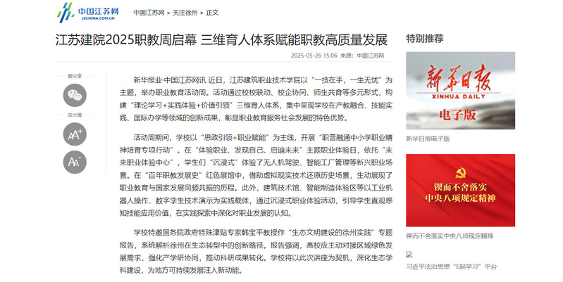 新華報業·中國江蘇網訊 近日,江蘇建筑職業技術學院以“一技在手,一生無憂”為主題,舉辦職業教育活動周。活動通過校校聯動、校企協同、師生共育等多元形式,構建“理論學習+實踐體驗+價值引領”三維育人體系,集中呈現學校在產教融合、技能實踐、國際辦學等領域的創新成果,彰顯職業教育服務社會發展的特色優勢。