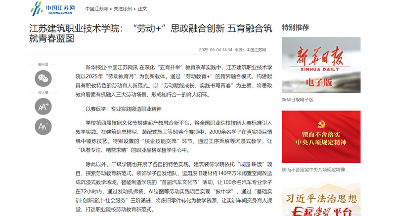新華報業·中國江蘇網訊 在深化“五育并舉”教育改革實踐中,江蘇建筑職業技術學院以2025年“勞動教育月”為創新載體,通過“勞動教育+”的跨界融合模式,構建起具有職教特色的勞動育人新范式。以“勞動賦能成長,實踐書寫青春”為主題,將思政教育要素有機融入三大勞動場景,形成知行合一的育人閉環。