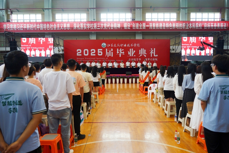 6月6日下午,我校2025屆畢業典禮在校體育館舉行。黨委副書記、校長沈士德,黨委副書記梁惠,黨委委員、紀委書記朱作付,黨委委員、副校長劉海波,黨委委員、副校長蔣兆峰,黨委委員、副校長朱鐵壁,相關職能部門負責人,各二級學院院長、教師代表、專兼職輔導員及2025屆全體畢業生參加典禮。畢業典禮由梁惠主持。