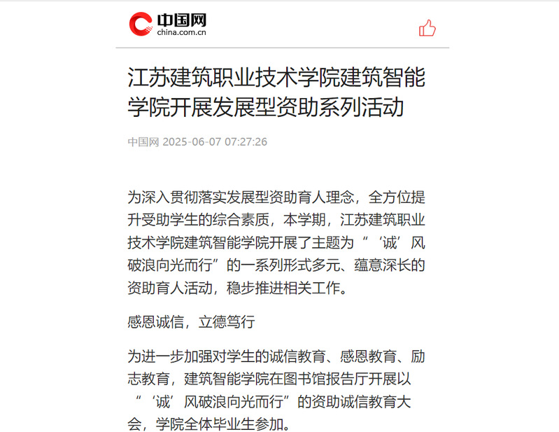 為深入貫徹落實(shí)發(fā)展型資助育人理念,全方位提升受助學(xué)生的綜合素質(zhì),本學(xué)期,江蘇建筑職業(yè)技術(shù)學(xué)院建筑智能學(xué)院開展了主題為“‘誠’風(fēng)破浪向光而行”的一系列形式多元、蘊(yùn)意深長的資助育人活動(dòng),穩(wěn)步推進(jìn)相關(guān)工作。