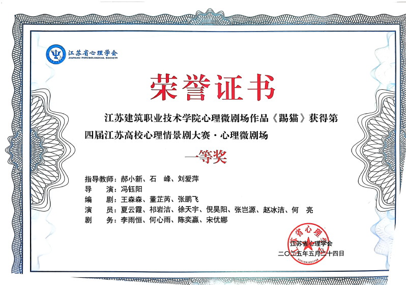 近日,由江蘇省心理學會主辦的第四屆江蘇高校心理情景劇大賽決賽在鹽城師范學院圓滿落幕,我校報送的心理微劇場劇目《踢貓》榮獲一等獎。