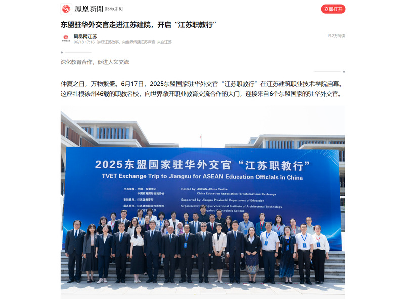 仲夏之日,萬(wàn)物繁盛。6月17日,2025東盟國(guó)家駐華外交官“江蘇職教行”在江蘇建筑職業(yè)技術(shù)學(xué)院?jiǎn)⒛弧_@座扎根徐州46載的職教名校,向世界敞開(kāi)職業(yè)教育交流合作的大門,迎接來(lái)自6個(gè)東盟國(guó)家的駐華外交官。