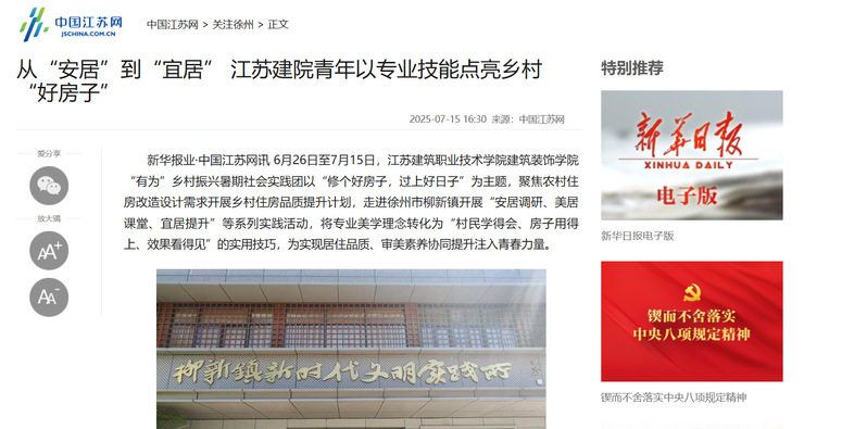 新華報業·中國江蘇網訊 6月26日至7月15日,江蘇建筑職業技術學院建筑裝飾學院“有為”鄉村振興暑期社會實踐團以“修個好房子,過上好日子”為主題,聚焦農村住房改造設計需求開展鄉村住房品質提升計劃,走進徐州市柳新鎮開展“安居調研、美居課堂、宜居提升”等系列實踐活動,將專業美學理念轉化為“村民學得會、房子用得上、效果看得見”的實用技巧,為實現居住品質、審美素養協同提升注入青春力量。