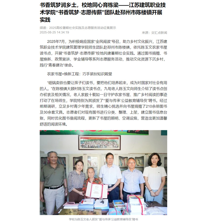 2025年7月,為積極響應國家“全民閱讀”號召,助力鄉村文化振興,江蘇建筑職業技術學院建筑管理學院師生團隊赴邳州市陳樓鎮,依托陳玉文農家書屋讀書點,開展“書香筑夢·志愿傳薪”校地共建暑期社會實踐。通過圖書捐贈、書屋煥新、政策宣講、學業輔導等系列志愿服務活動,推動文化資源下沉鄉村,踐行“青春建功”使命。