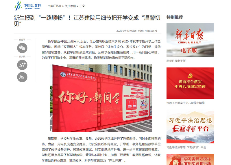 新華報業·中國江蘇網訊 近日,江蘇建筑職業技術學院 2025 年秋季學期開學工作全面啟動。圍繞“立德樹人”根本任務,學校以“讓學生安心、家長放心”為目標,提前做好各項準備,從數字迎新到思政引領,從教學保障到生活服務,用一系列貼心舉措,為學子們打造安全、溫馨的開學環境,確保新學期教育教學平穩起步。