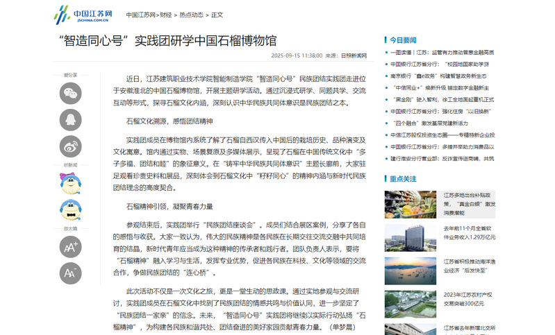 近日,江蘇建筑職業(yè)技術學院智能制造學院“智造同心號”民族團結實踐團走進位于安徽淮北的中國石榴博物館,開展主題研學活動。通過沉浸式研學、同題共學、交流互動等形式,探尋石榴文化內涵,深刻認識中華民族共同體意識是民族團結之本。