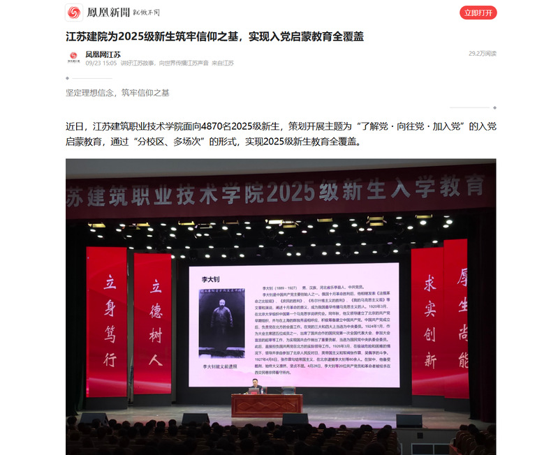 近日,江蘇建筑職業技術學院面向4870名2025級新生,策劃開展主題為“了解黨?向往黨?加入黨”的入黨啟蒙教育,通過“分校區、多場次”的形式,實現2025級新生教育全覆蓋。