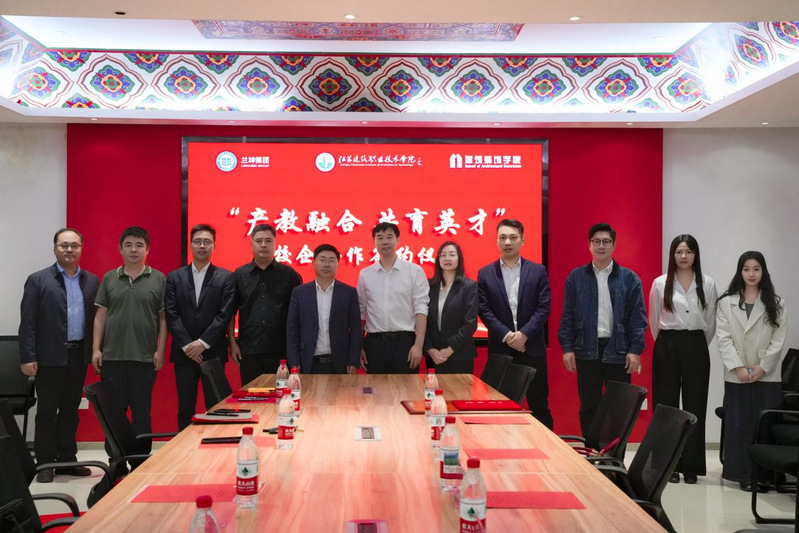儀式上,沈士德代表學校致辭。他詳細介紹了我校發展歷程、辦學特色與育人成果,并強調深化產教融合是職業教育高質量發展的必由之路。他指出,本次合作不僅是學校與企業資源互補的重要舉措,更是共同探索“人才立交橋”“協同創新窗”與“產教融合新標桿”的生動實踐。魏鋒分享了江蘇蘭坤控股集團有限公司的戰略布局與技術優勢,并表達了對校企協同育人、共謀發展的堅定信心。隨后,校企雙方簽署合作協議,沈士德與魏鋒共同為“畢業生就業基地”揭牌。