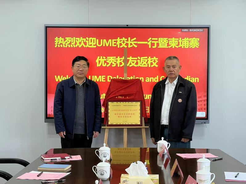 會后,雙方舉行了“建心筑夢”來華留學生中國國情教育實踐基地揭牌儀式,以及馬德望應用技術學院教育裝備資源捐贈儀式。