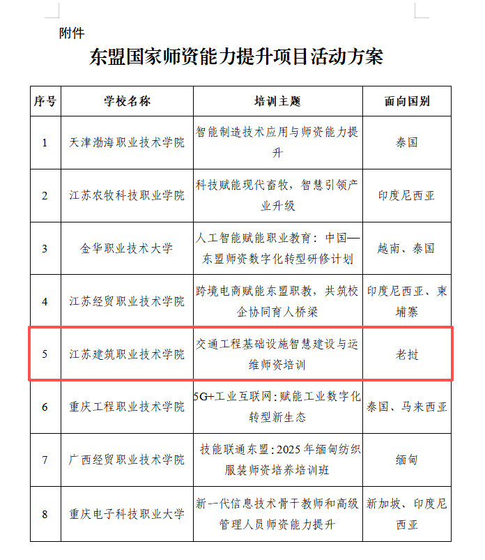 近日,中國教育國際交流協會公布2025-2026年東盟國家師資能力提升項目活動方案入選名單,我校申報的項目《交通工程基礎設施智慧建設與運維師資培訓》順利入選并獲資助。